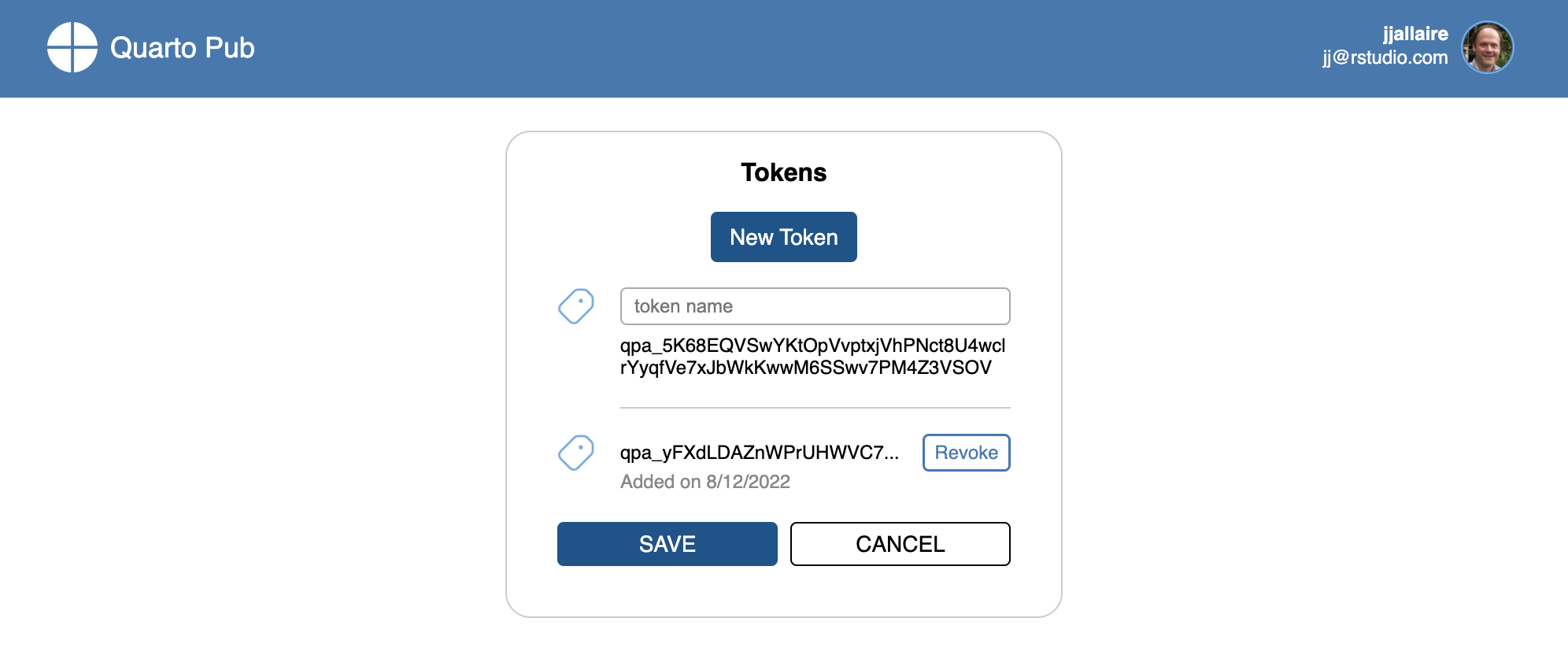 wish to remain available.You can also view (and revoke) access tokens from the admin interface at https://quartopub.com: