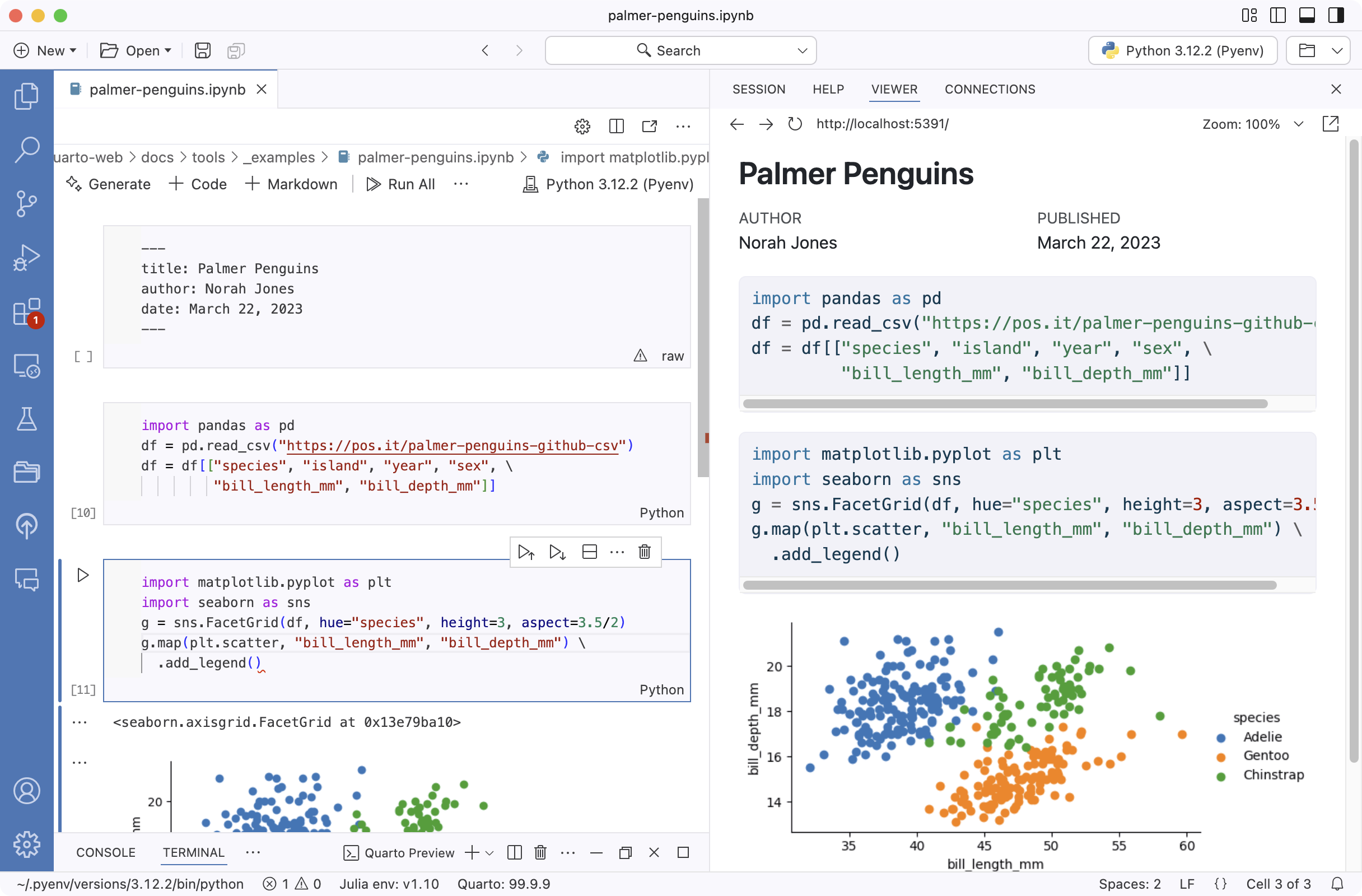 In addition to editing Quarto documents as plain-text .qmd files, you can also use the Positron Notebook Editor to author .ipynb notebooks that are rendered with Quarto. In this article we’ll review the basics of editing .ipynb notebooks for use with Quarto.